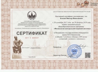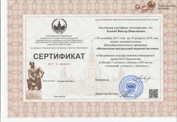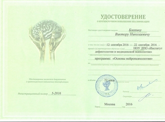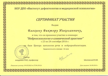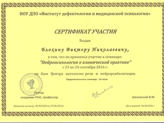 Сертификат "Нейропсихология в клинической практике Выдан "Центр патологии речи и нейрореабилитации" 2016 год