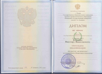 Диплом "Педагог - психолог" Выдан "РГУ им С. А. Есенина" 2011 год