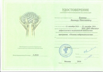 Удостоверение "Основы нейропсихологии" Выдан "Центр патологии речи и нейрореабилитации" 2016 год