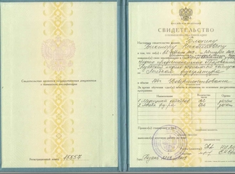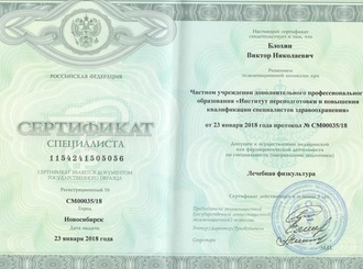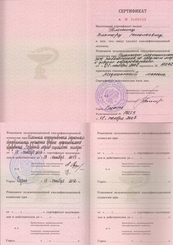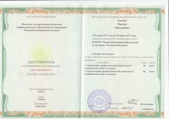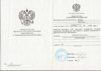 Свидетельство о повышении квалификациии по специальностям 1. "Лечебная физкультура" 2. " Массаж" Выдан "ГОУ ВПО Рязанский медуниверстиет" 2009 год