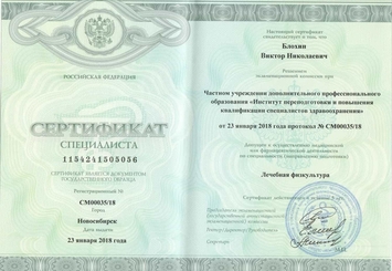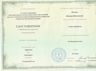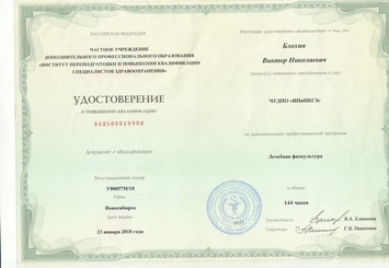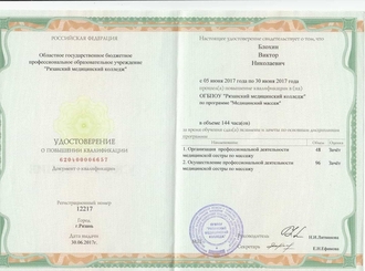 Свиделельство "О повышении квалификации по лечебной физкультуре" Выдан "Рязанский медицинский колледж" 2013 год