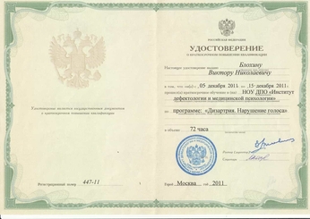 Удостоверение "Дизартрия и нарушение голоса" Выдан "Центр патологии речи и нейрореабилитации" 2011 год